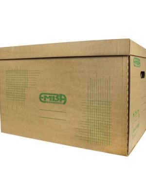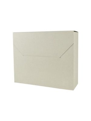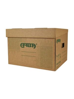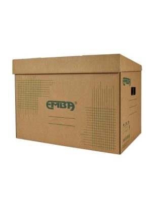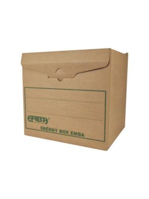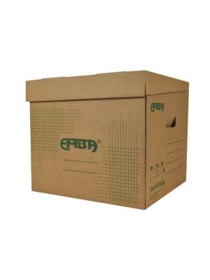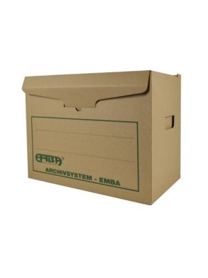 Úložná škatuľa vyrobená s výklopným vrchnákom z hnedej vlnitej lepenky. Určená na uloženie 4 ks zakladačov šírky chrbta 8 cm alebo archívnych boxov EMBA TYP I/75. Rozmery 330x300x295 mm.