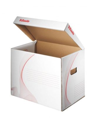 Škatuľa z hnedej vlnitej lepenky so sklápacím vekom a zelenou potlačou na ukladanie a archiváciu 5 zakladačov šírky 8 cm alebo archívnych boxov I/-75 mm. Rozmery (š x v x d) 425 x 330 x 300 ...