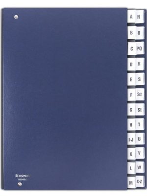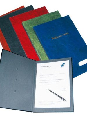 Podpisová kniha 14-dielna s okienkom na prednej strane na jednoduchú výmenu popisovateľného štitka, rozťahovateľný chrbát pre zvýšenie kapacity. Úprava v imitácii kože.Farba: modráPočet oddielov: 14