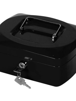 Uzamykateľná pokladnička s tvarovaným úchytom, plastovou priehradkou na mince a 2 kľúčami. Materiál pevná oceľ. Rozmery 155 × 75 × 120 mm. Farba čierna.