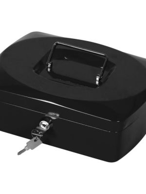 Uzamykateľná pokladnička s tvarovaným úchytom, plastovou priehradkou na mince a 2 kľúčami. Materiál pevná oceľ. Rozmery 205 × 85 × 160 mm. Farba čierna.