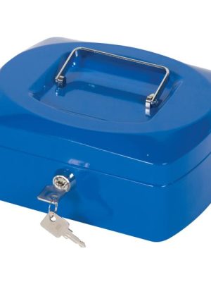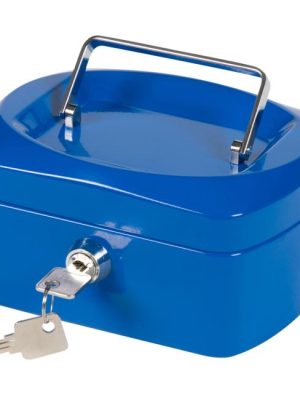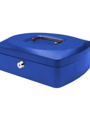 Uzamykateľná pokladnička s tvarovaným úchytom, plastovou priehradkou na mince a 2 kľúčami. Materiál pevná oceľ. Rozmery 325 × 85 × 235 mm. Farba modrá.