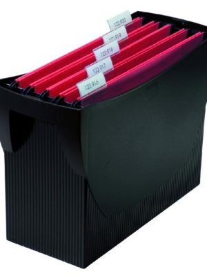 Prenosný box HAN na závesné obaly alebo zakladače bez veka. Rozmery boxu 390 × 260 × 150 mm. Farba: čierna