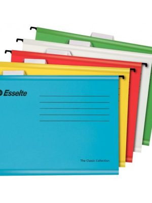 Závesné obaly Esselte kolekcie Classic vyrobené z pevného kartónu. Lisované dno obalu dovoľuje zvýšiť kapacitu na 30 mm. Súčasťou obalu je násuvný index z priehľadného plastu s výmenným papierovým štítkom. Formát A4, rozpätie vodiacich ...