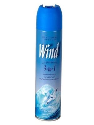 Osviežovač vzduchu Wind v spreji s neutralizérom pachov. Aerosol rychle a účinne osvieži vzduch vôňou horskej vône.
