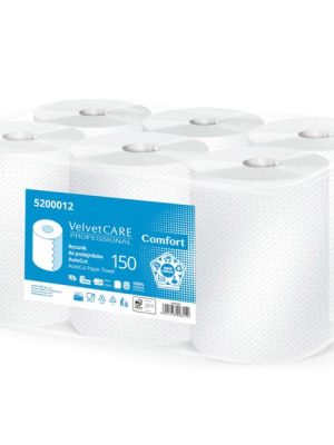 Pevné a mäkké 2-vrstvové uteráky AutoCut Velvet CARE Professional AutoCut 150 Comfort – 150 metrov a 600 útržkov na rolke. Priemer vnútornej dutiny 38 mm, 6 roliek v balení, ...