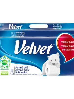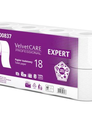 Extra jemný 3-vrstvový toaletný papier Velvet CARE Professional Expert s návinom 18 metrov a 150 útržkami na kotúči. 8 roliek v balení, 100 % celulóza.