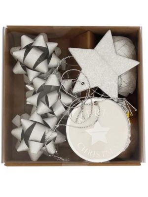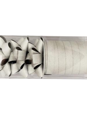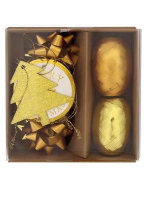 Vianočná súprava na balenie darčekov. Obsahuje: stužky 5mmx10m – 2 kusy, mašle – 6 ks, štítky na darčeky – 6 ks.