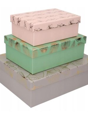 Súprava darčekových krabíc 3 veľkosti Kvet List Ginko 3 ks. Vyrobené z hrubého kartónu. Zdobené metalickou zlatou potlačou. Elegantné jemné pastelové farby. Vhodné na akúkoľvek príležitosť. Krabice sú zabalené ...