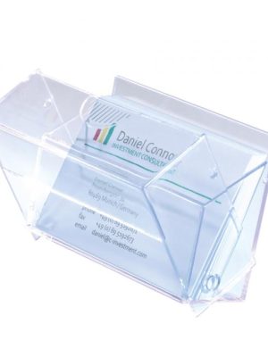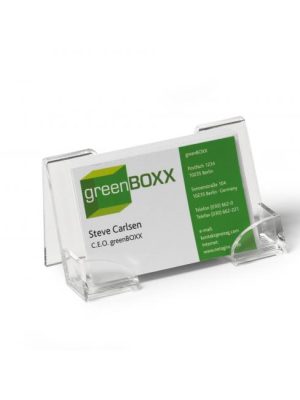 Jednoduchý a zároveň štýlový stolový stojan na vizitky. Dodávaný so samolepiacimi protišmykovými podložkami. Kapacita 50 vizitiek maximálnej šírky 100 mm. Farba číra. Kapacita: 50 vizitiek
