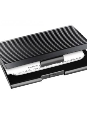 Elegantná matná čierna krabička na vizitky a magnetické karty z kvalitného kovu na bezpečné skladovanie a dokonalú ochranu až 20 vizitiek max. rozmerov 91 × 56 mm. Drážkovaný povrch ...