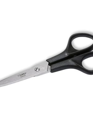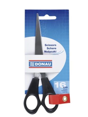 Kancelárske nožnice na strihanie papiera, kartónu, lepenky, samolepiacej pásky a pod. s pogumovaným úchytom a strihacou časťou z nehrdzavejúcej ocele. Farba čierna.Veľkosť: 16 cm