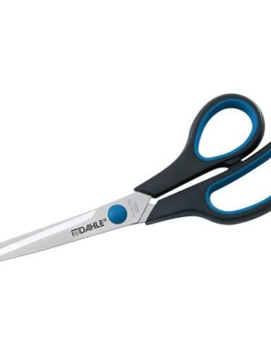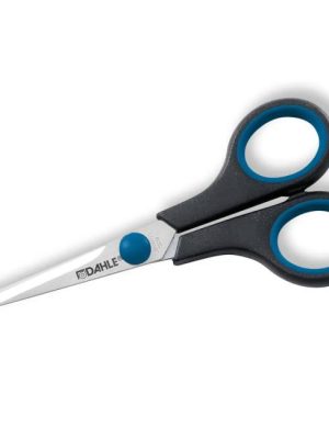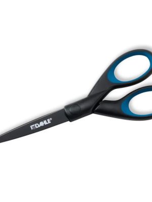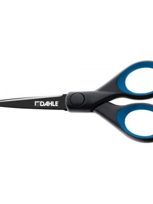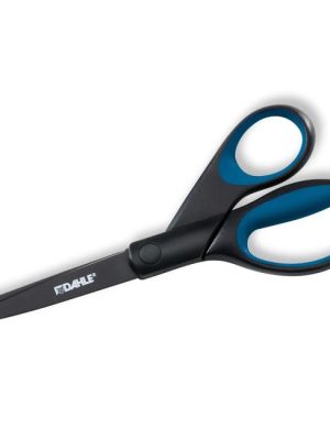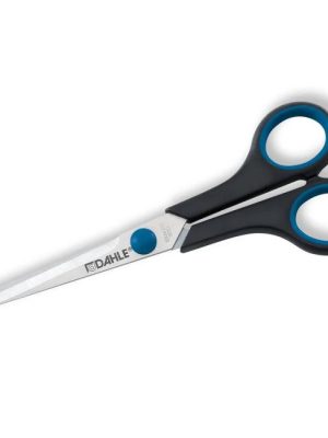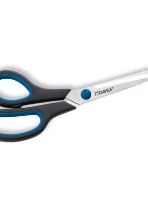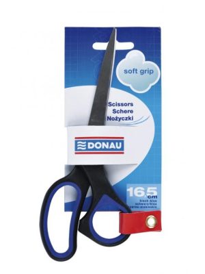 Kancelárske nožnice na strihanie papiera, kartónu, lepenky, samolepiacej pásky a pod. s pogumovaným úchytom a strihacou časťou z nehrdzavejúcej ocele. Farba čierna/-modrá.Veľkosť: 16,5 cm