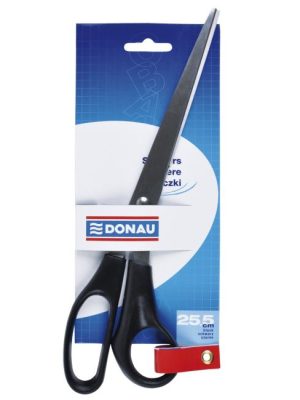 Univerzálne kancelárske nožnice na strihanie papiera, kartónu, lepenky, samolepiacej pásky a pod. so strihacou časťou z nehrdzavejúcej ocele. Farba čierna. Väčšie balenie 12 ks.Veľkosť: 25,5 cm