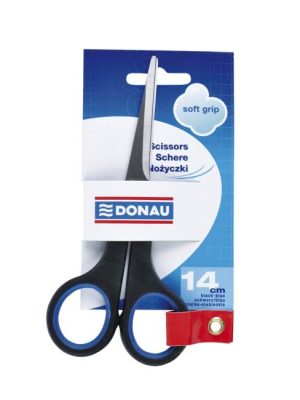 Kancelárske nožnice na strihanie papiera, kartónu, lepenky, samolepiacej pásky a pod. s pogumovaným úchytom a strihacou časťou z nehrdzavejúcej ocele. Farba čierna/-modrá.Veľkosť: 14 cm