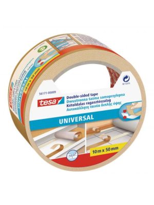 Univerzálna obojstranná páska ideálna na koberce a trvalé spojenie rôznych materiálov, na ručné práce a dekorácie. Rozmery 50 mm × 10 m.