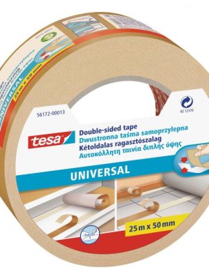 Univerzálna obojstranná páska ideálna na koberce a trvalé spojenie rôznych materiálov, na ručné práce a dekorácie. Rozmery 50 mm × 25 m.