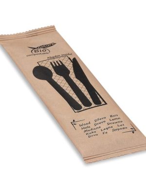 Hygienicky zabalená sada drevených príborov obsahuje nôž, vidličku a papierový obrúsok. Príbor má dĺžku 16,5 cm a je vyrobený z dreva. Papierový obrúsok má 2-vrstvy, rozmer 24x24cm, skladanie 1/8 ...