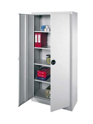 Univerzálna kovová skriňa do kancelárií, skladov a dielní. 4 nastaviteľné police s nosnosťou 50 kg pri rovnomernom zaťažení police, cylindrický zámok s trojcestným rozvorovým mechanizmom a 2 kľúčami. Hladká povrchová úprava vypalovaným lakom v sivom odtieni RAL 7035.Rozmery (š ...