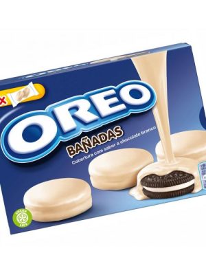 Kakaové sušienky s náplňou s vanilkovou príchuťou celomáčané v bielej čokoláde. Alergény Pšeničná múka, Sušené odtučnené mlieko, Pšeničný škrob, Laktóza (z mlieka), Sušená srvátka (z mlieka), Mliečny tuk, ...
