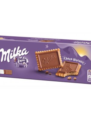 Chrumkavé maslové sušienky Milka Choco Biscuit s tabuľkou mliečnej čokolády z alpského mlieka sú to pravé potešenie počas dňa. Hmotnosť 150 g. Alergény Pšeničná múka, Sušené plnotučné ...