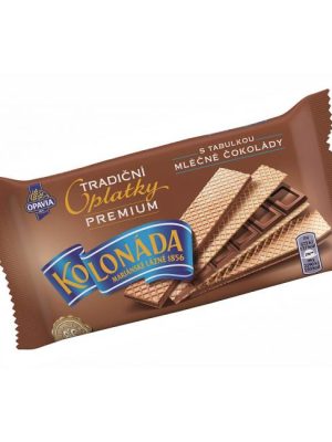 Trandičné krehké oblátky Kolonáda plnené tabuľkou mliečnej čokolády. Hmotnosť 92 g. Alergény Mliečna čokoláda 73 % , sušená srvátka (z mlieka), sušené odtučnené mlieko, mliečny tuk, emulgátory (sójový ...