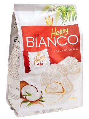 Oblátky s kokosovou náplňou v bielej poleve, posypané strúhaným kokosom. Hmotnosť 140 g. Zloženie: biela poleva 32,9 % (cukor, plne stužený rastlinný tuk – palmojadrový, sušená srvátka z mlieka, ...