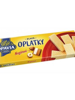 Jemné oblátky OPAVIA s nugátovou príchuťou. Hmotnosť 146 g. Alergény PŠENIČNÁ múka, Sušená srvátka (z MLIEKA), Laktóza (z MLIEKA), Sušené odtučnené MLIEKO, LIESKOVOORIEŠKOVÁ pasta 0,7 %, Emulgátor (SÓJOVÝ ...