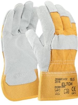 Rukavice s dlaňou z hovädzej štiepanej kože, zadná časť z bavlnenej tkaniny, vystužená manžeta. Odporúčané použitie: určené pre suché prostredie. Sektor: stavebníctvo. Materiál: dlaň zo šedej hovädzej štiepenky, chrbát ...