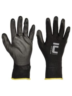 Pletené, bezšvové, nylonové rukavice, s tenkou vrstvou polyuretánu v dlani a na prstoch a pružnou manžetou. Materiál máčania: polyuretánMateriál rukavíc: polyamid (nylon), Pletený Normy:EN ISO 21420 EN 388 (4131X)
