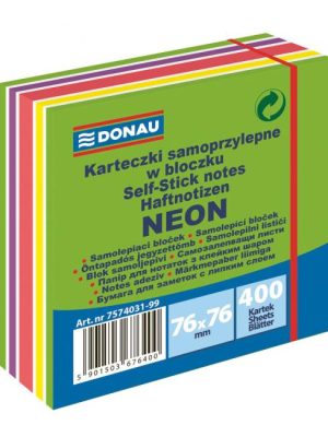 Samolepiace bločky v tvare kocky. Kocku je možné „otvoriť“ a odobrať ktorýkoľvek lístok bez toho, aby sa rozlepila. 5 neónových farieb (zelená, žltá, ružová, oranžová a červená) po 80 lístkov. Rozmer 76 x 76 mm.