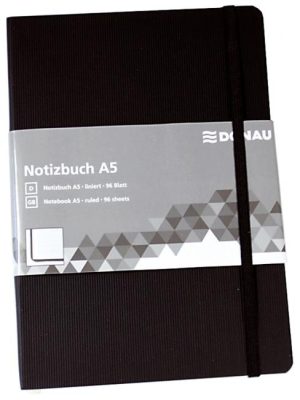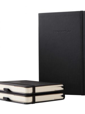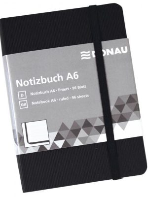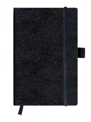Zápisníky s gumičkou. Obal z mäkkej imitácie kože, signálny pásik, archívne vrecko s priehradkou na karty. 96 listov, gramáž 80 g/m². Formát A5. Prevedenie linajkové. Farba čierna.