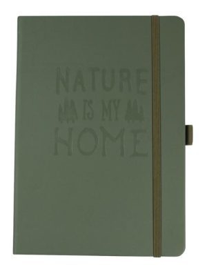Zápisník outdoorový A5, štvorčekový. Vodoodolný obal s dizajnovým razením, 56 listov vodoodpudivého papiera, 120 g/m². S pútkom na pero, gumičkou a archívnym vreckom. Farba olivová.