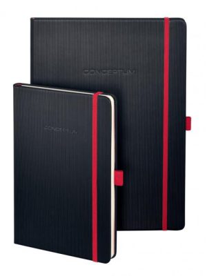 Zápisník s elastickou gumičkou, lacetkou a pútkom na pero v červenej farbe. Pevná čierna väzba s jemným ryhovaním. 194 číslovaných linajkových strán gramáže 80g/m2., adresár. Formát A5.