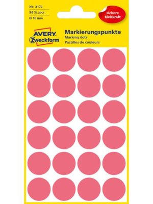 Farebné kruhové odnímateľné etikety na ručný popis. Po odlepení nezanechávajú na podklade stopy lepidla. Farba červená.Priemer 18 mm. Počet etikiet v balení 96 kusov.