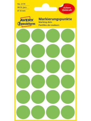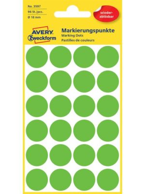 Farebné kruhové odnímateľné etikety na ručný popis. Po odlepení nezanechávajú na podklade stopy lepidla. Farba zelená.Priemer 18 mm. Počet etikiet v balení 96 kusov.