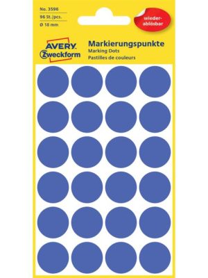 Farebné kruhové odnímateľné etikety na ručný popis. Po odlepení nezanechávajú na podklade stopy lepidla. Farba modrá.Priemer 18 mm. Počet etikiet v balení 96 kusov.