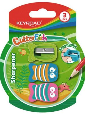 Súprava obsahuje tri samostatné strúhadlá KEYROAD v tvare ryby s otvormi na ceruzku/pastelku s priemerom 8 mm.
