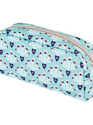 Saténová polyesterová tkanina, kvetinová podšívka vo vnútri puzdra. Pútko na konci puzdra umožňuje jeho ľahké prenášanie. Hlavné vrecko na zips. Rozmery: 21 x 7 x 8 cm. Farba modrá.