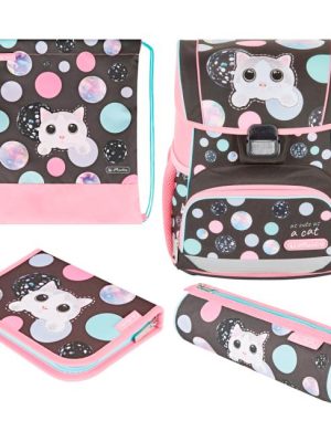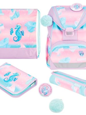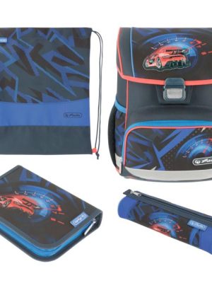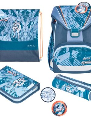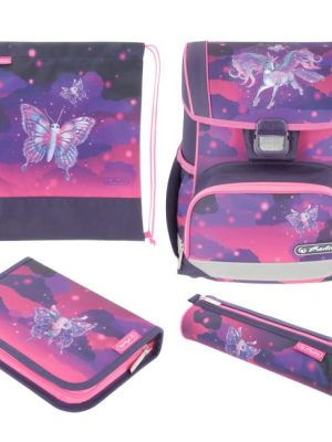 Školská taška s výbavou, s anatomicky tvarovaným polstrovaným a priedušným chrbtom, nastaviteľnými ramennými popruhmi, predným vreckom na zips, dvomi bočnými vreckami s elastickými pásikmi, stabilnou spodná doskou s nožičkami, pohodlnou ...
