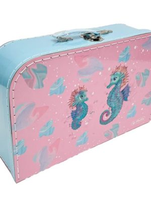 Papierový kufrík na školské pomôcky, lesklý, s vnútornou grafikou, kovové zatváranie. Rozmery: 35 × 23 × 10 cm. Motív: Morský koník.