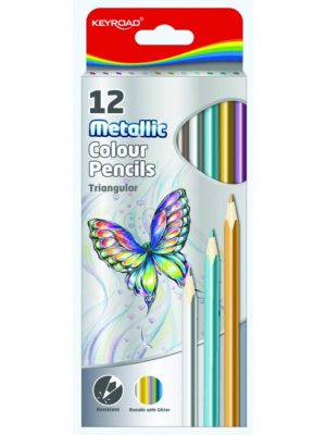 Trojhranné metalické farbičky, ideálne na maľovanie omaľovániek. Mäkký grafit, ľahko strúhateľné. 12 ks, mix metalických farieb.