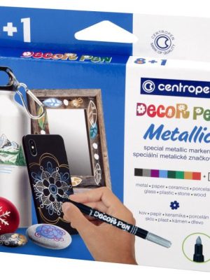 Sada 8 metalických odtieňov a 1 biely popisovač určený k dekorácii rôznych materiálov (lakový papier, kov, sklo, fólia, keramika, kraslica, kameň). Svetlostály pigmentový atrament na vodnej báze. Stopa písma ...