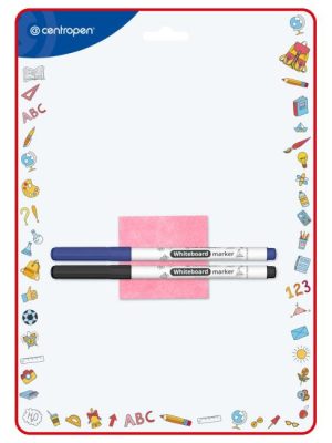 Obojstranne stierateľná tabuľka CENTROPEN 18 x 24 cm s vytlačenými linkami. Vhodná na nácvik písania a kreslenia. Obsahuje 2 značkovače centropen 2507, čierny a modrý. Kartónové balenie: 20 ks