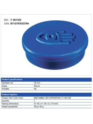 Okrúhle trvácne keramické magnety s farebným plastovým krytom.Farba: modráPrítlačná sila: 100 gBalenie: 10 ks