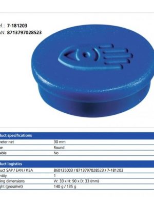 Okrúhle trvácne keramické magnety s farebným plastovým krytom.Farba: modráPrítlačná sila: 300 gBalenie: 10 ks
