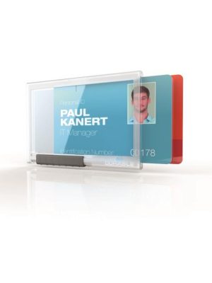 Visačka na karty v uzavretom prevedení na 2 ID karty/bezpečnostné preukazy. Krištáľovo čistý materiál pre optimálnu čitateľnosť a jednoduché skenovanie čiarových kódov. S otvorom pre palec pre ľahké vybratie ...