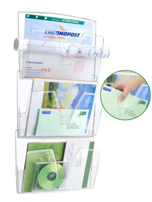 Kombinovaný stojan s tromi odkladačmi na prospekty a časopisy formátu A4 s tromi odkladačmi a závesným dielom na stenu, resp. stôl. Materiál priehľadný plast. Hrúbka 24 mm. Vnútorné rozmery ...
