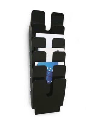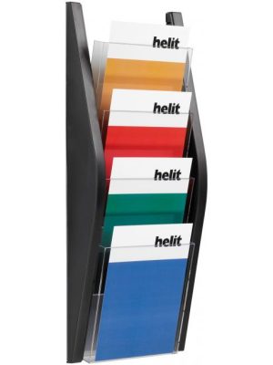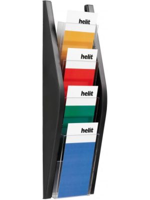 Nástenný stojan na prezentáciu materiálov. Štyri priehľadné priehradky slúžia na umiestnenie materiálov formátu A5. Materiál kvalitný plast. Rozmery (š x v x h) 215 x 540 x 80 mm. Farba čierna.