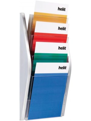 Nástenný stojan na prezentáciu materiálov. Štyri priehľadné priehradky slúžia na umiestnenie materiálov formátu A4. Materiál kvalitný plast. Rozmery (š x v x h) 275 x 540 x 80 mm. Farba strieborná.
